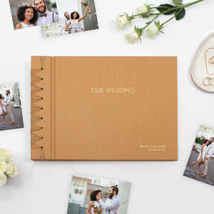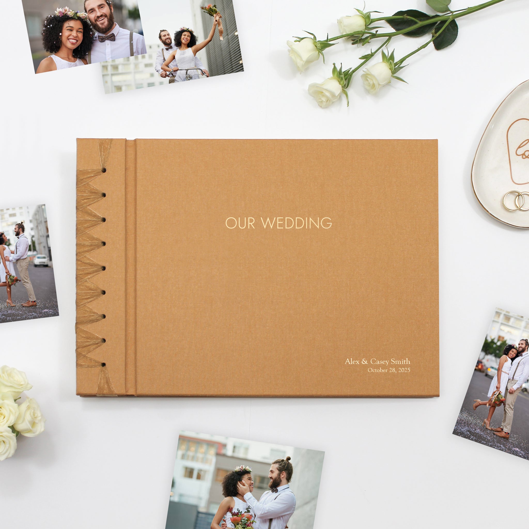 PERSONALIZATION: We can emboss a name, date, or a short message onto the front cover to add a distinctive, personal touch to your Wedding Album. The font we use is Goudy, and we can emboss one or two lines in the lower right corner, and up to 25 characters per line. See additional product images for personalization examples. The “OUR WEDDING” embossed title is featured in the front cover.