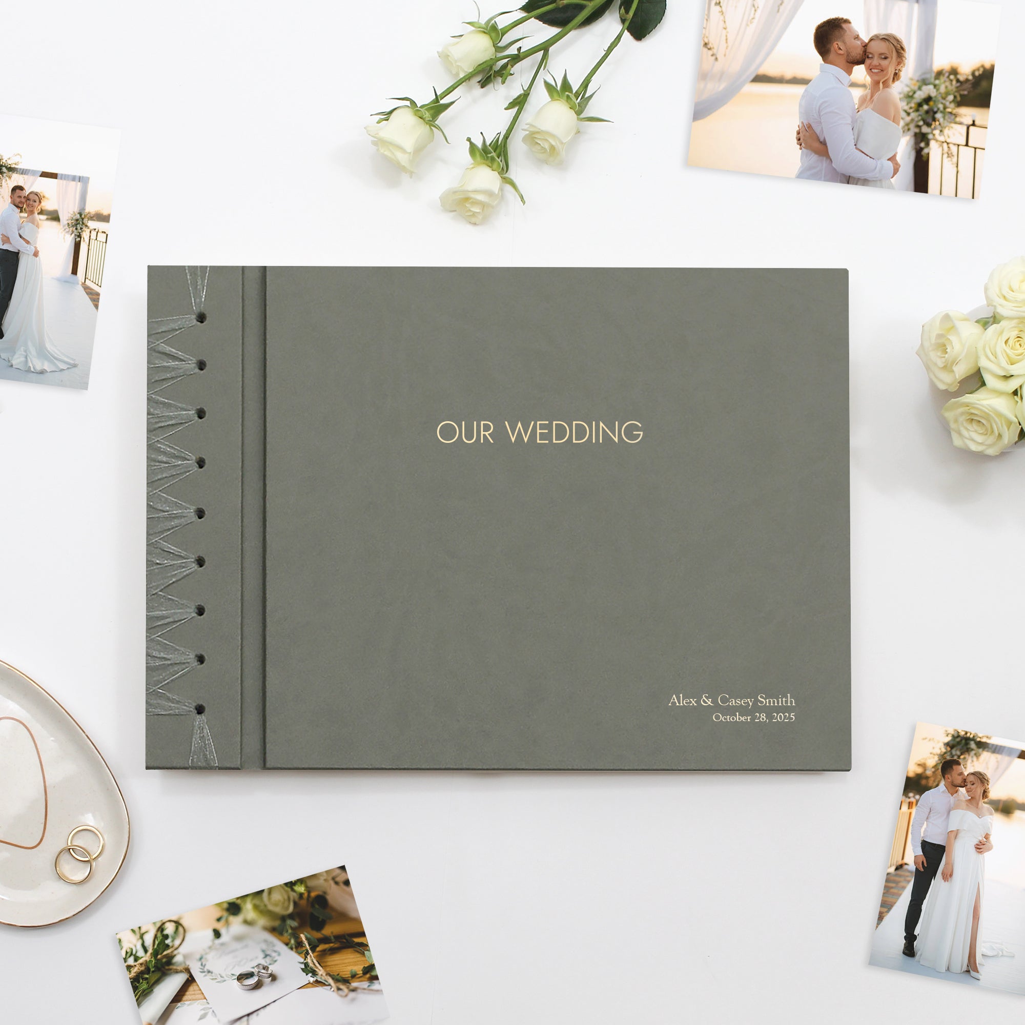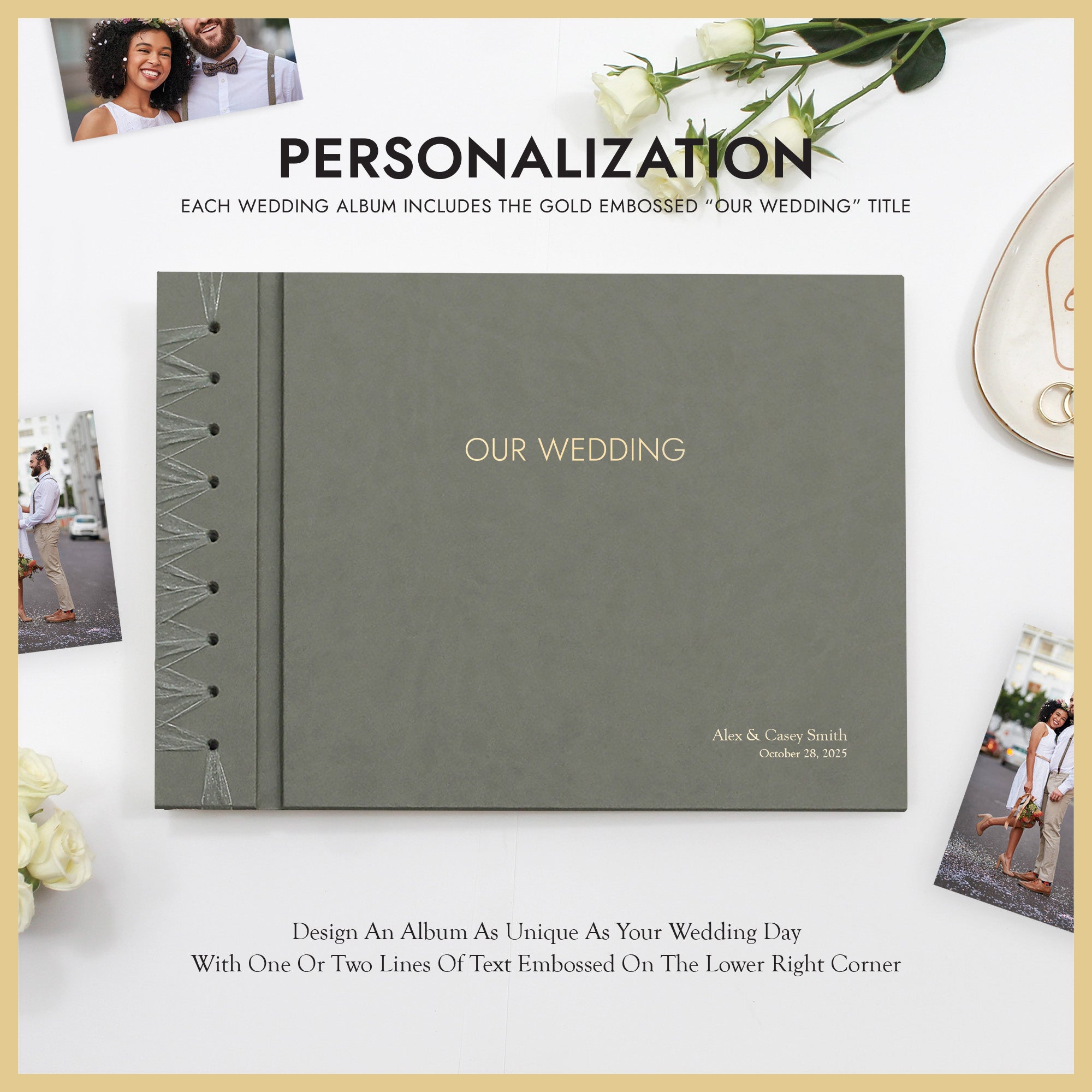 PERSONALIZATION: We can emboss a name, date, or a short message onto the front cover to add a distinctive, personal touch to your Wedding Album. The font we use is Goudy, and we can emboss one or two lines in the lower right corner, and up to 25 characters per line. See additional product images for personalization examples. The “OUR WEDDING” embossed title is featured in the front cover.