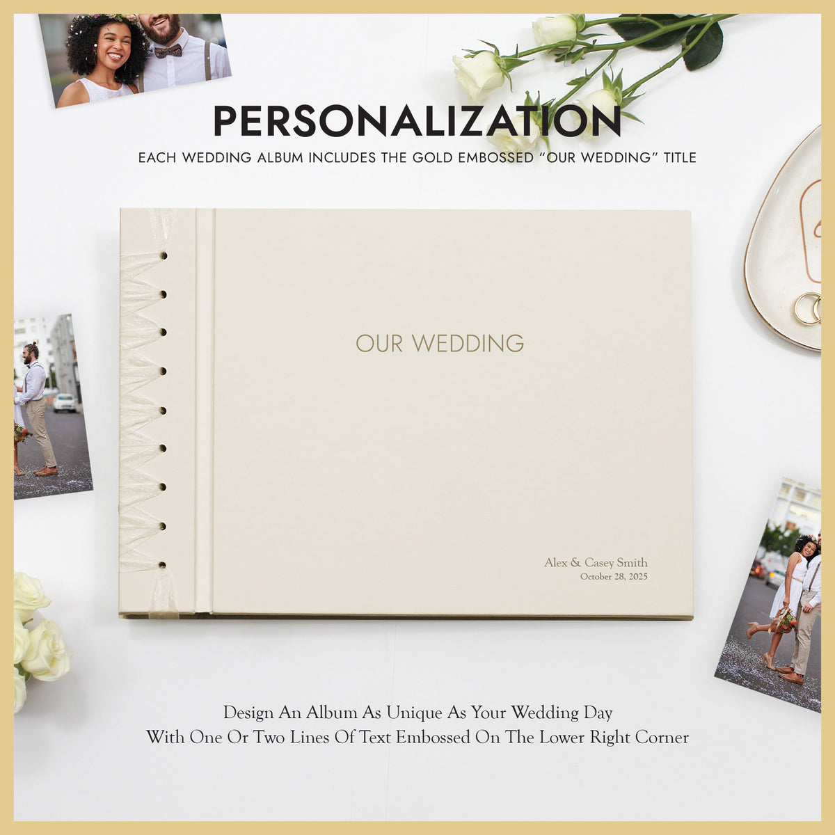 PERSONALIZATION: We can emboss a name, date, or a short message onto the front cover to add a distinctive, personal touch to your Wedding Album. The font we use is Goudy, and we can emboss one or two lines in the lower right corner, and up to 25 characters per line. See additional product images for personalization examples. The “OUR WEDDING” embossed title is featured in the front cover.