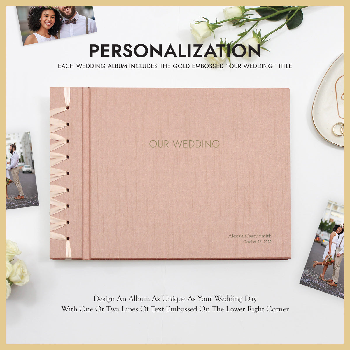 PERSONALIZATION: We can emboss a name, date, or a short message onto the front cover to add a distinctive, personal touch to your Wedding Album. The font we use is Goudy, and we can emboss one or two lines in the lower right corner, and up to 25 characters per line. See additional product images for personalization examples. The “OUR WEDDING” embossed title is featured in the front cover.