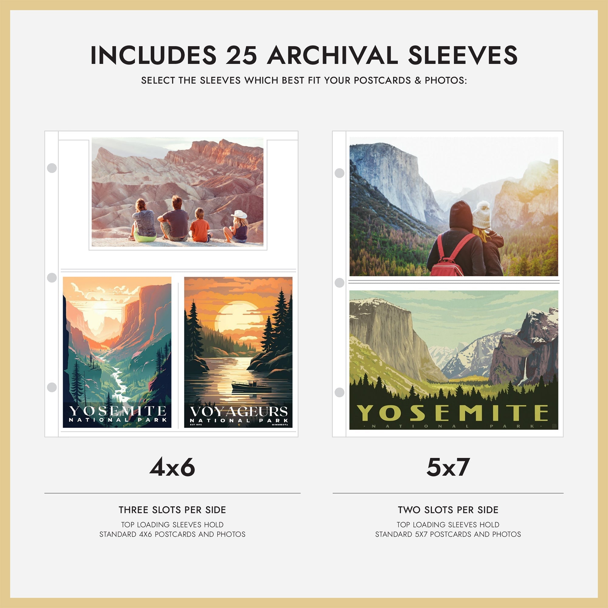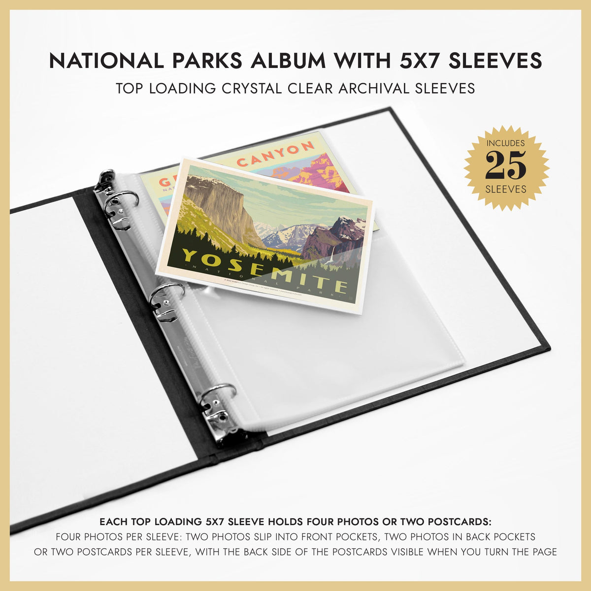 25 5x7 sleeves will hold 50 postcards or 100 photos