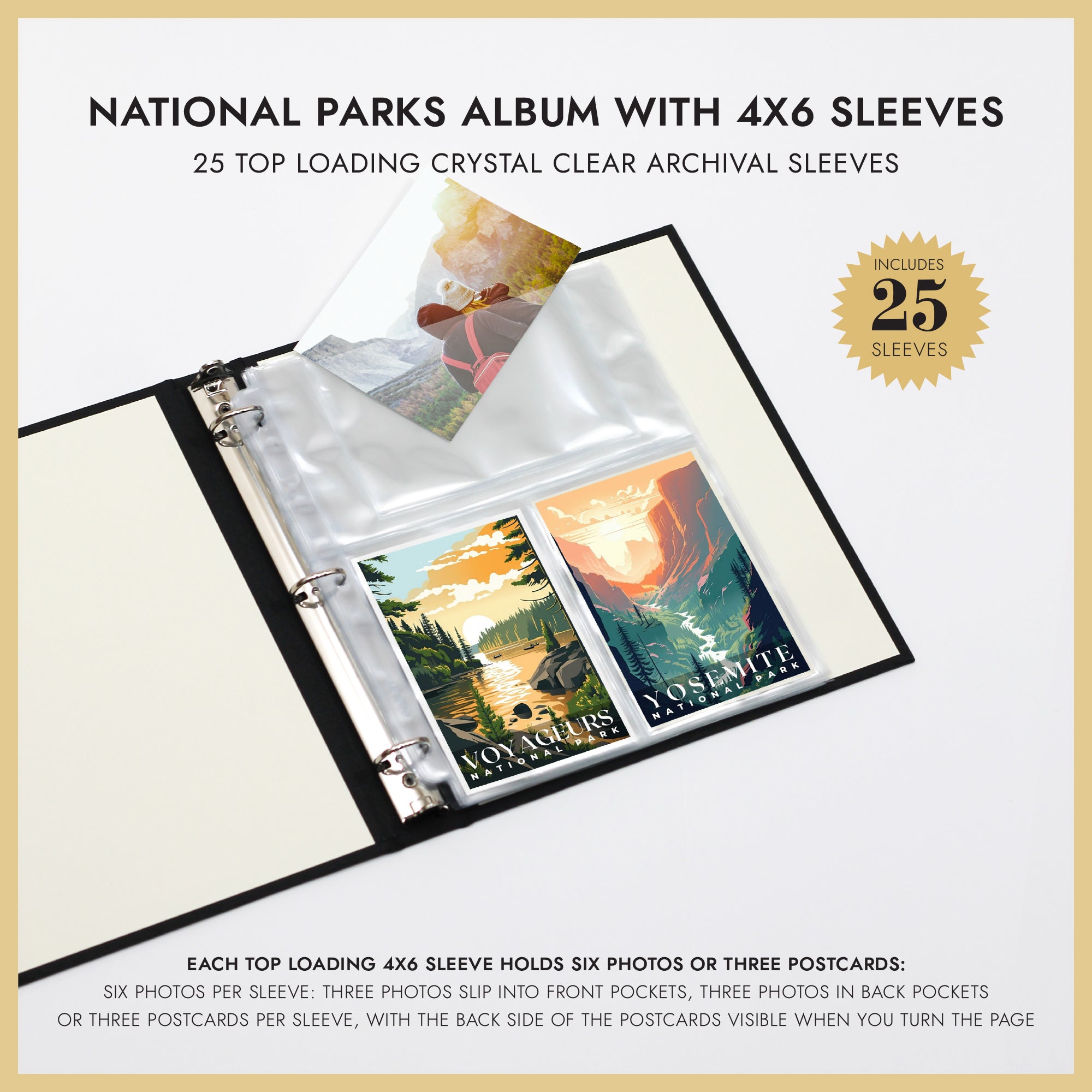 25 4x6 sleeves will hold 75 postcard or 150 photos
