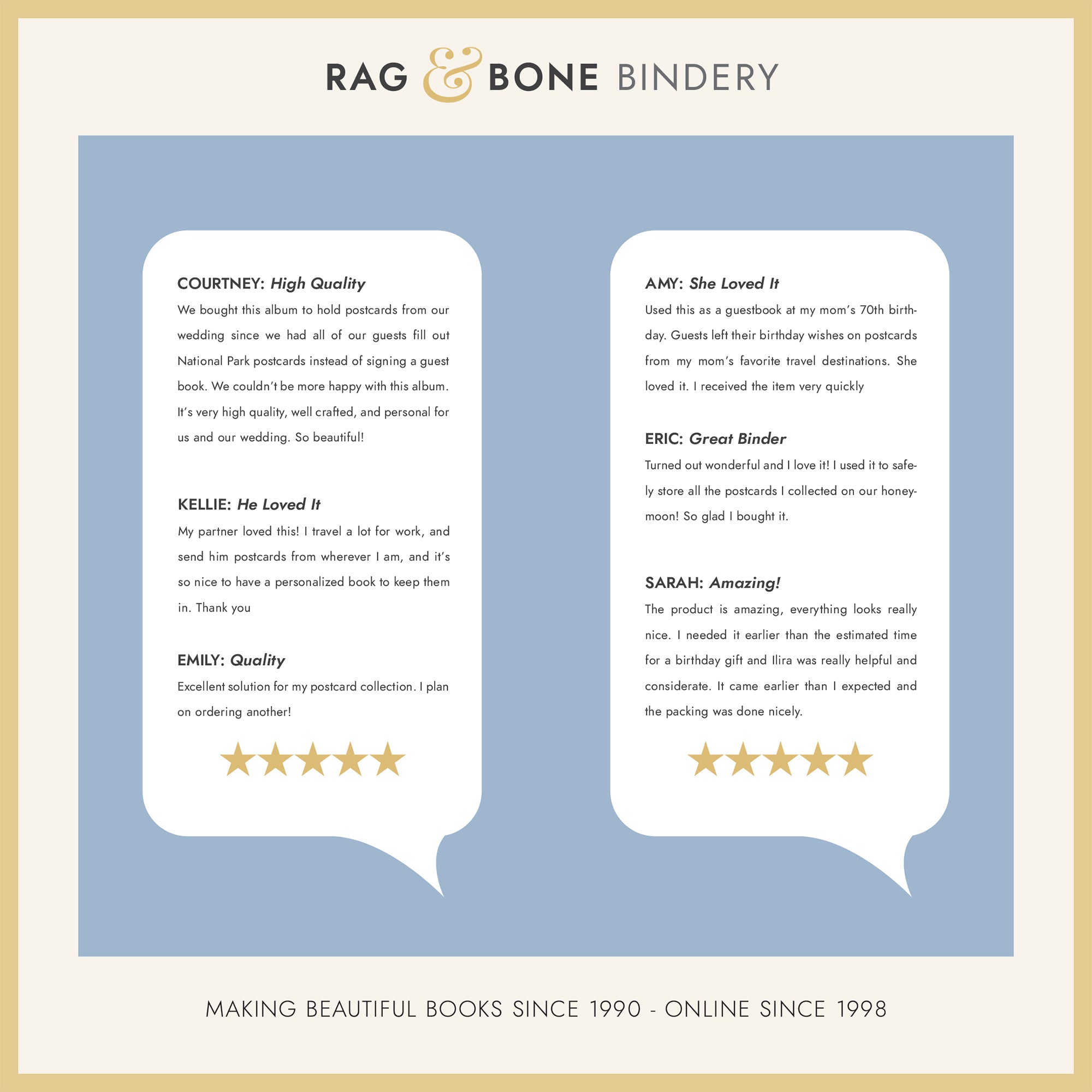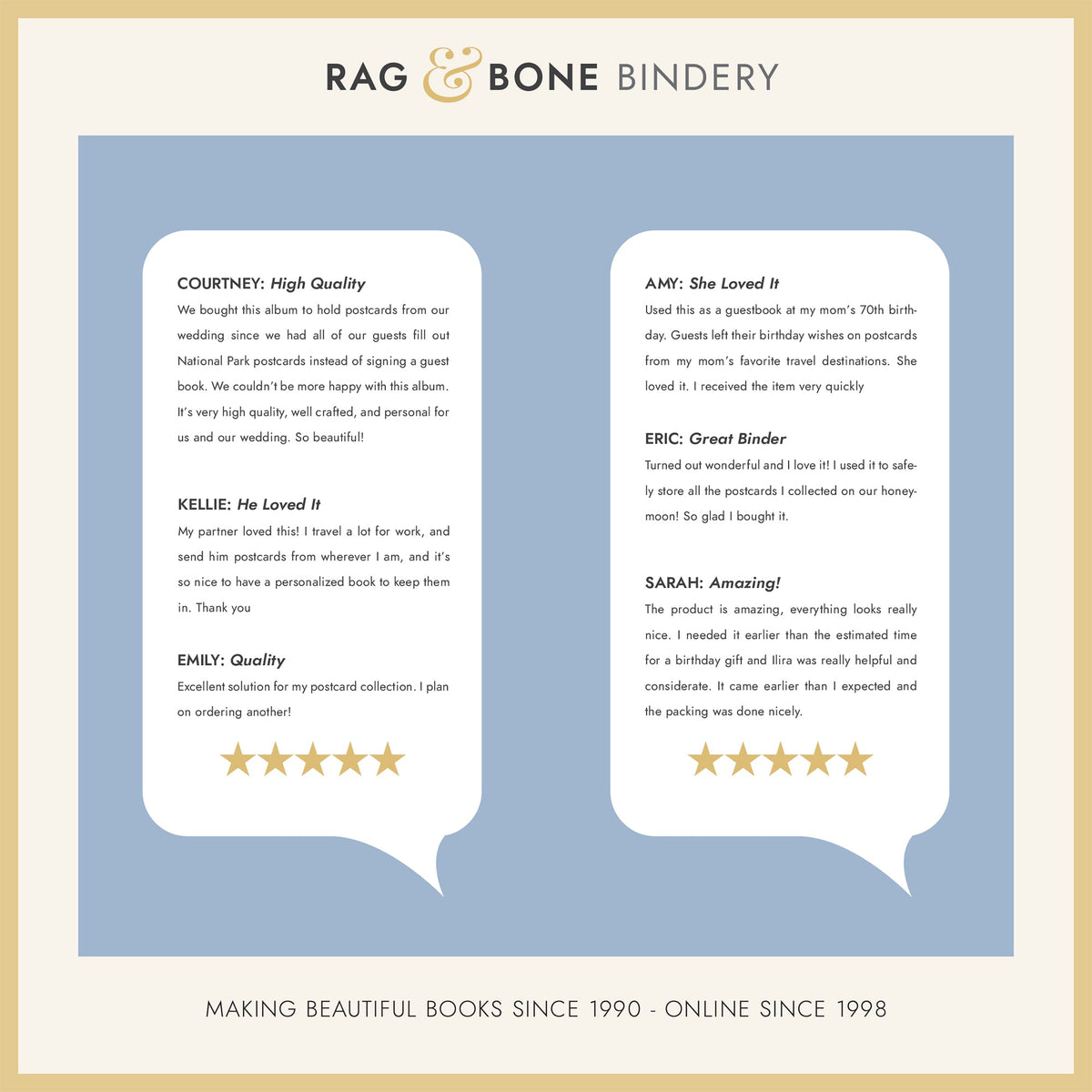 At heart, Rag & Bone Bindery is a family affair and we promise authenticity, quality, and care with every book we make. What began in 1990 as a shared interest in bookbinding and all things bookish between owners Jason Thompson & Ilira Steinman has endured for over 30 years as a unique bookbinding studio with a history rooted in fine craftsmanship and classic design. All of our Albums and Journals are bound by hand in our renovated historic mill building located in Pawtucket, Rhode Island.