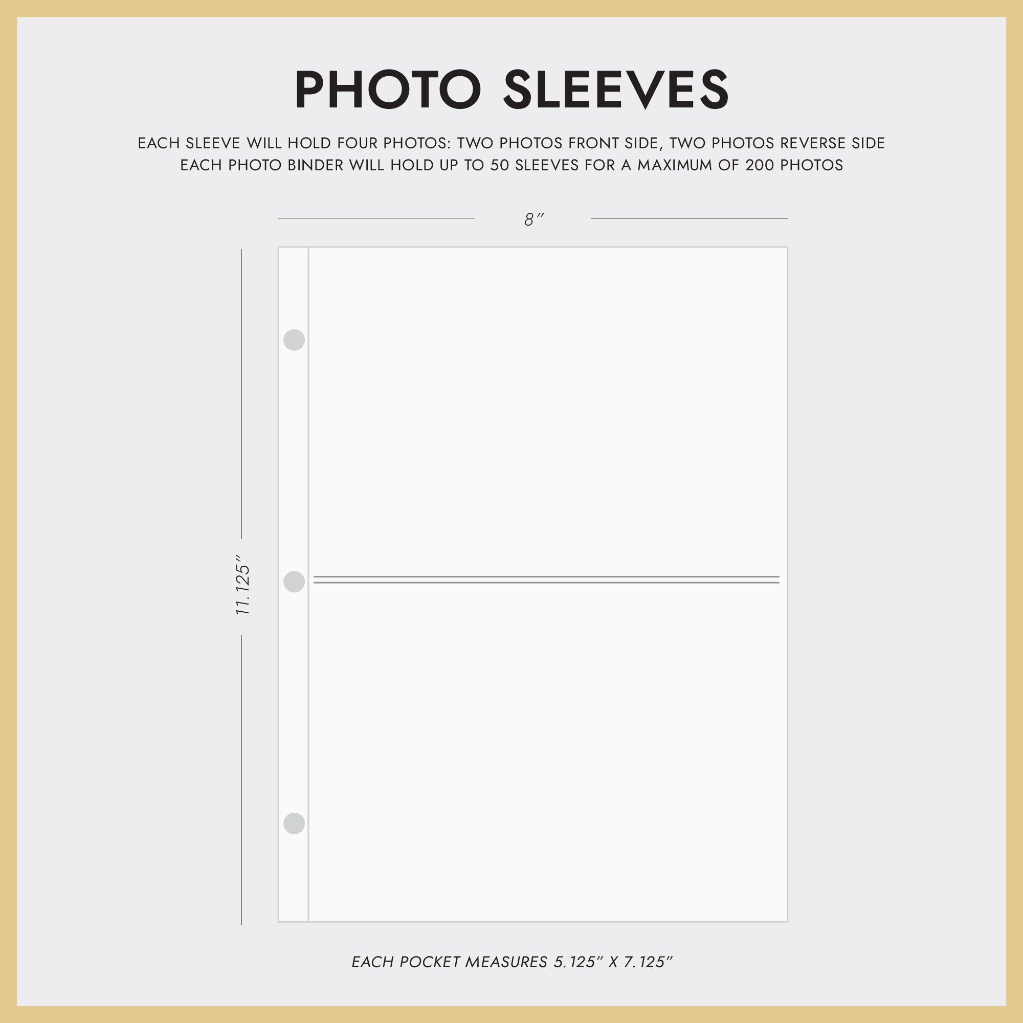 INSIDE: Photo Binders include clear sleeves, each designed to hold four 5x7 photos. Select the 25 sleeve option for 100 photos or the 50 sleeve option to accommodate up to 200 photos. Large 5x7 Photo Binders hold a maximum of 200 photos.