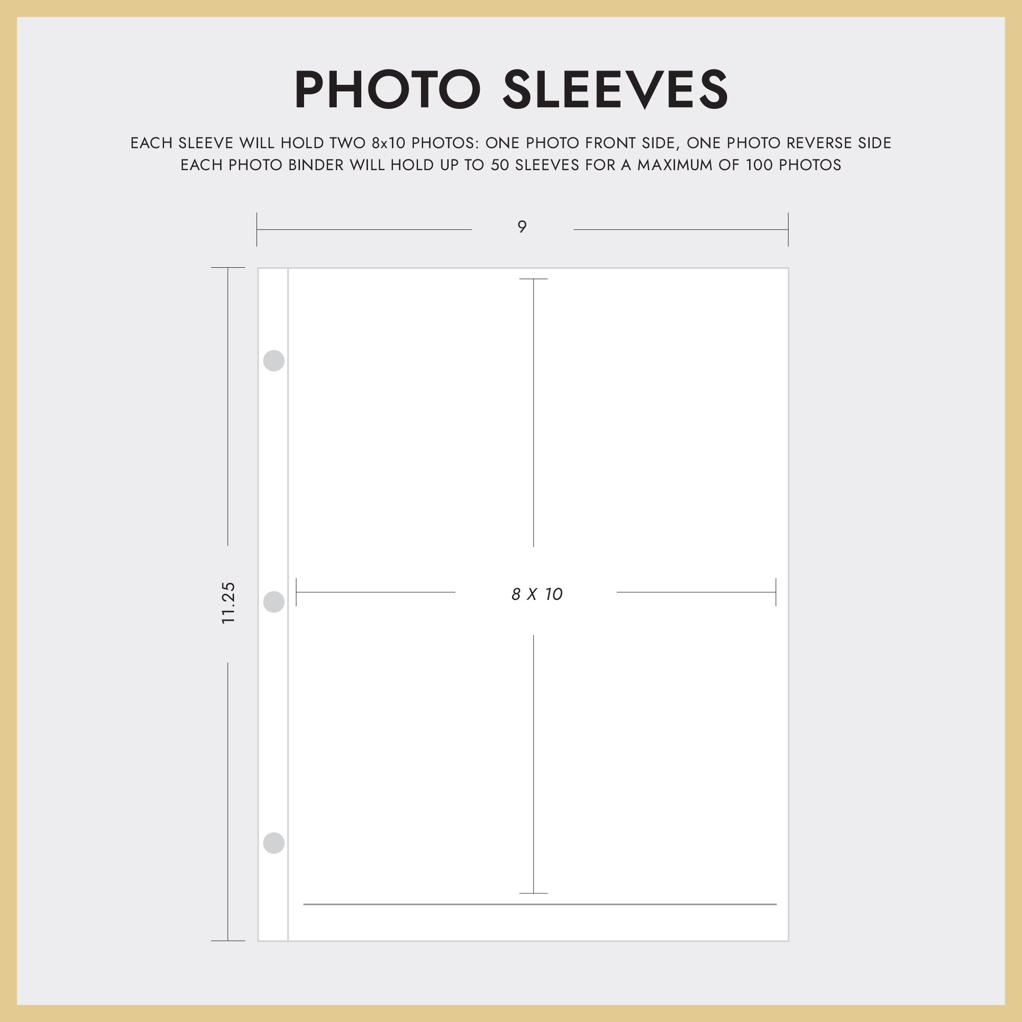 INSIDE: Photo Binders include clear sleeves, each designed to hold two 8x10 photos. Select the 25 sleeve option for 50 photos or the 50 sleeve option to accommodate up to 100 photos. Large 8x10 Photo Binders hold a maximum of 100 photos.