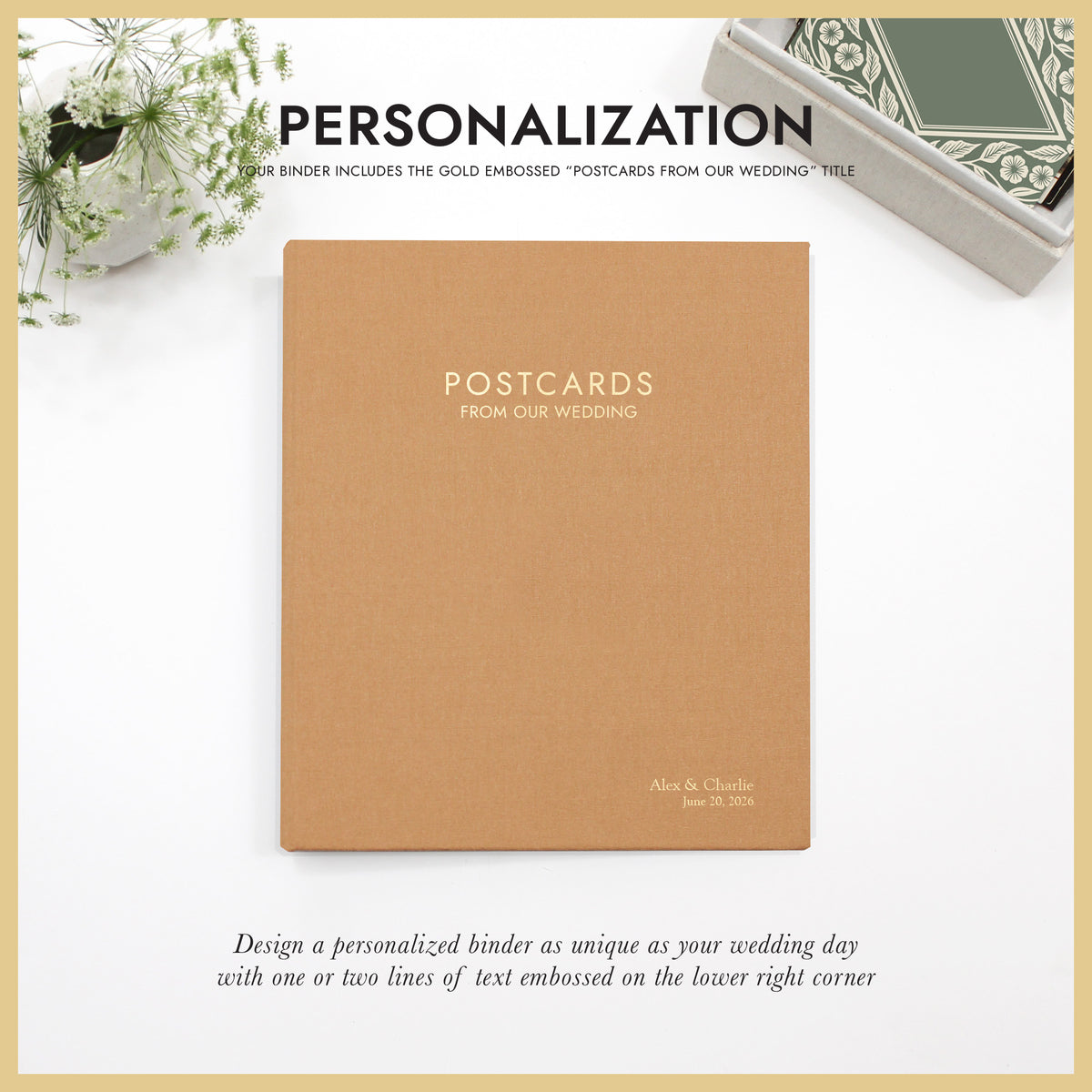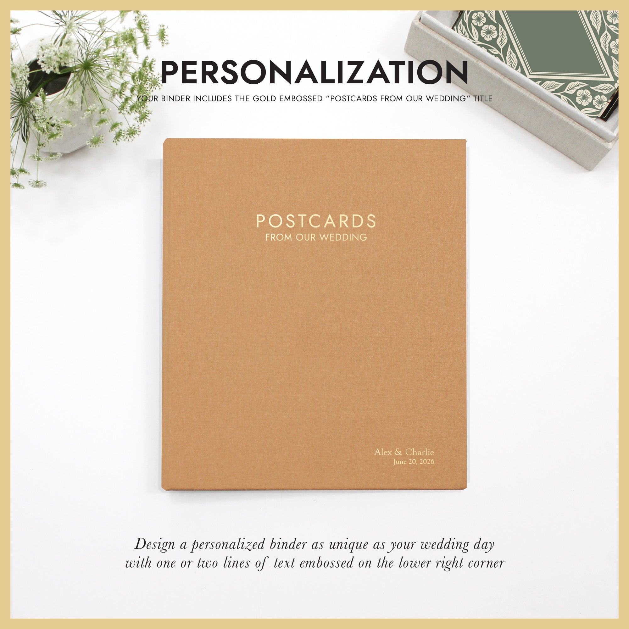 FEATURES: Featuring an elegantly embossed "POSTCARDS FROM OUR WEDDING" title, the binder includes premium, pvc-free, archival sleeves to protect your precious cards from fading and damage. Crystal clear sleeves are available for either 4x6 or 5x7 postcards. The transparent sleeves showcase both sides of each postcard.