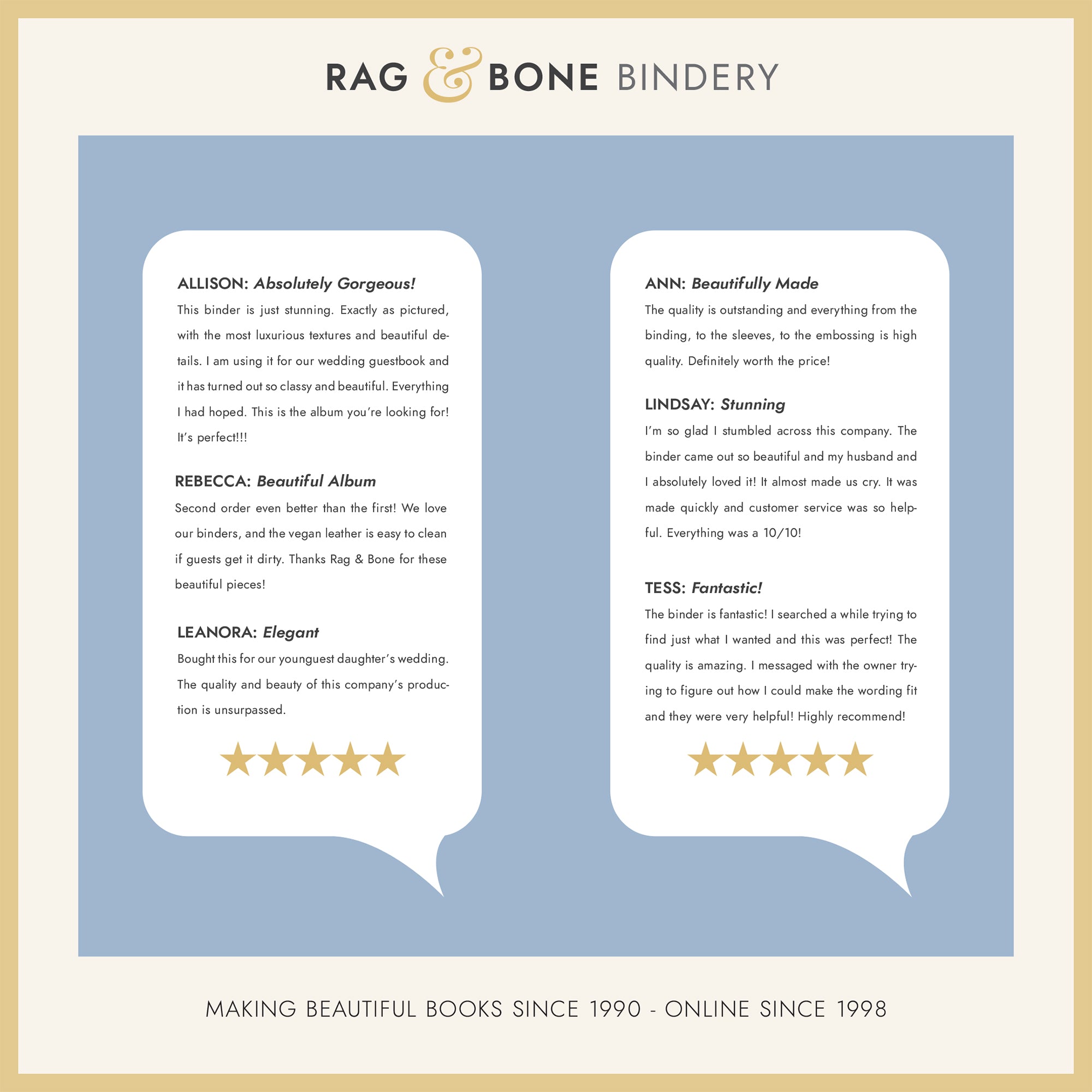 You provide the postcards for guests to share their love and good wishes; we provide the beautiful binder to keep those memories safe forever. Inspired by the trend of using postcards in lieu of the traditional guestbook, the Rag & Bone Bindery "Postcards From Our Wedding" Binder is a beautiful way to preserve and display heartfelt messages from your special day. This handcrafted keepsake protects your postcards so you can relive the joy and well wishes of your wedding for years to come. Simply provide postcards to your guests for personal messages to preserve and save within your beautiful Wedding Postcard binder.