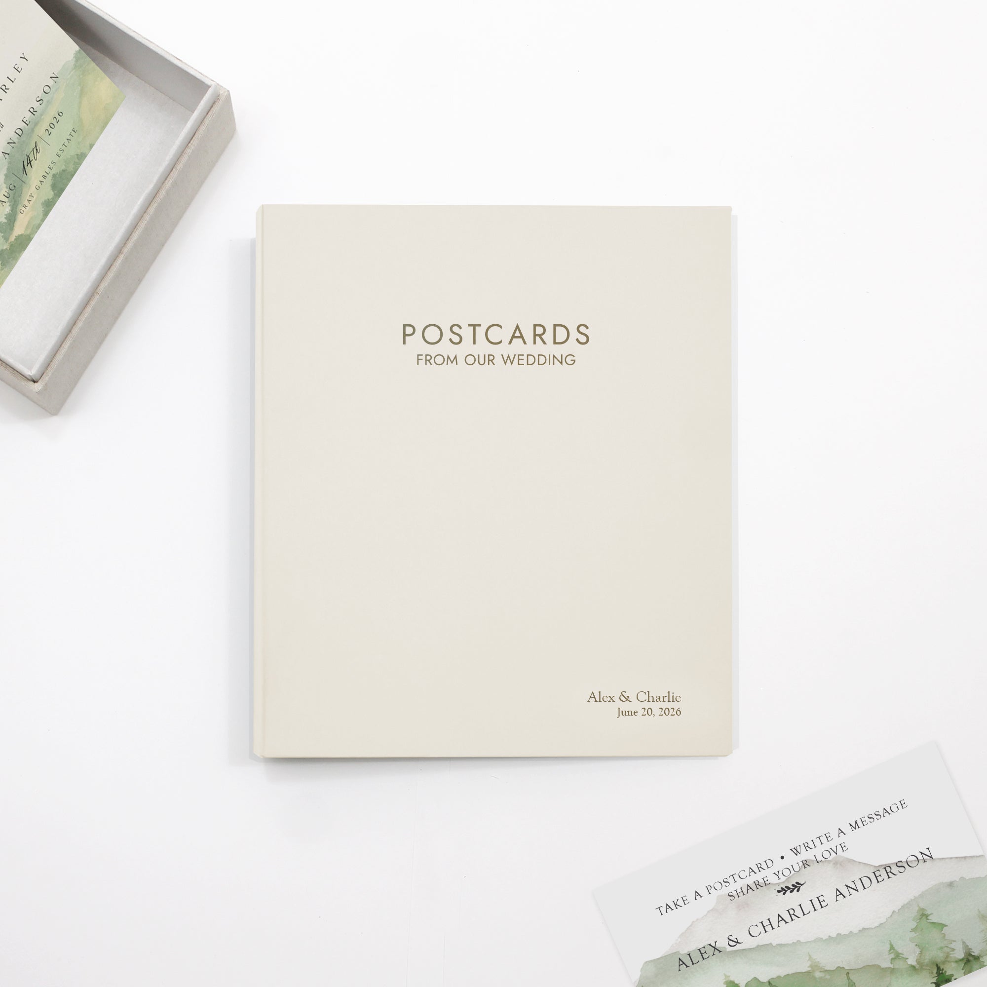 You provide the postcards for guests to share their love and good wishes; we provide the beautiful binder to keep those memories safe forever. Inspired by the trend of using postcards in lieu of the traditional guestbook, the Rag & Bone Bindery "Postcards From Our Wedding" Binder is a beautiful way to preserve and display heartfelt messages from your special day. This handcrafted keepsake protects your postcards so you can relive the joy and well wishes of your wedding for years to come. Simply provide postcards to your guests for personal messages to preserve and save within your beautiful Wedding Postcard binder.