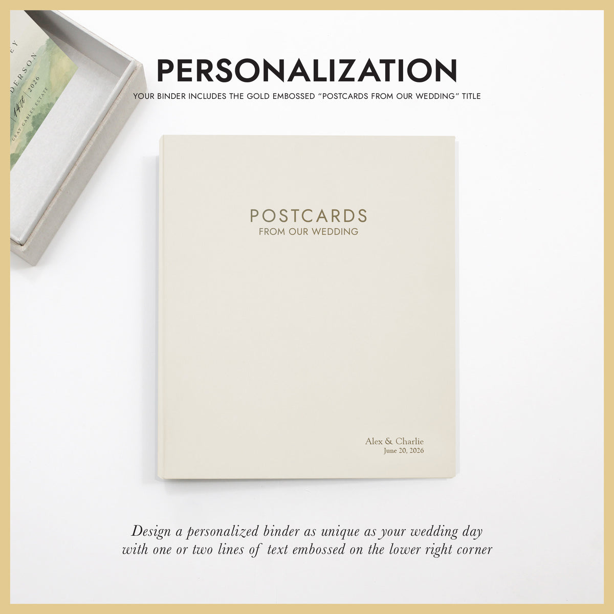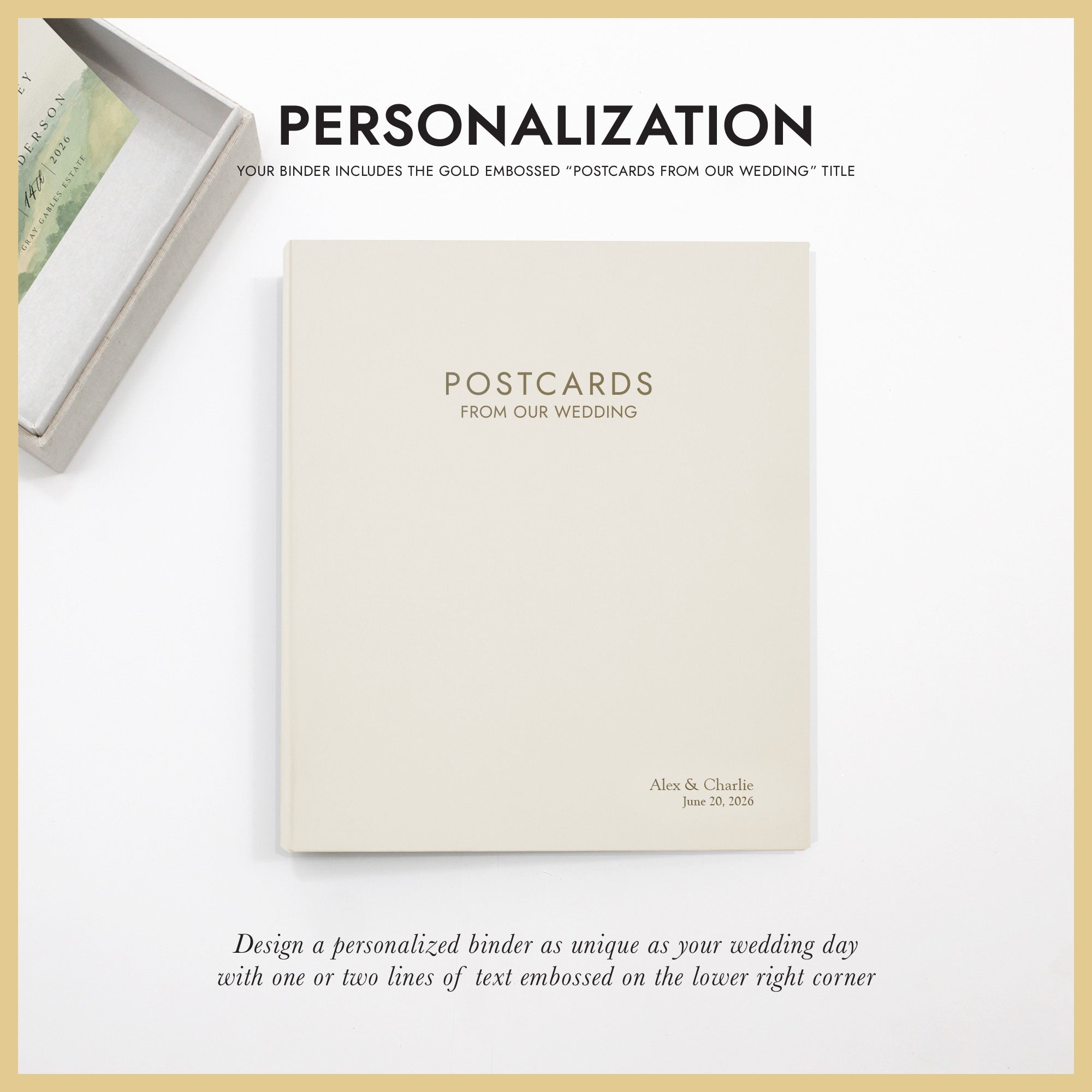 FEATURES: Featuring an elegantly embossed "POSTCARDS FROM OUR WEDDING" title, the binder includes premium, pvc-free, archival sleeves to protect your precious cards from fading and damage. Crystal clear sleeves are available for either 4x6 or 5x7 postcards. The transparent sleeves showcase both sides of each postcard.