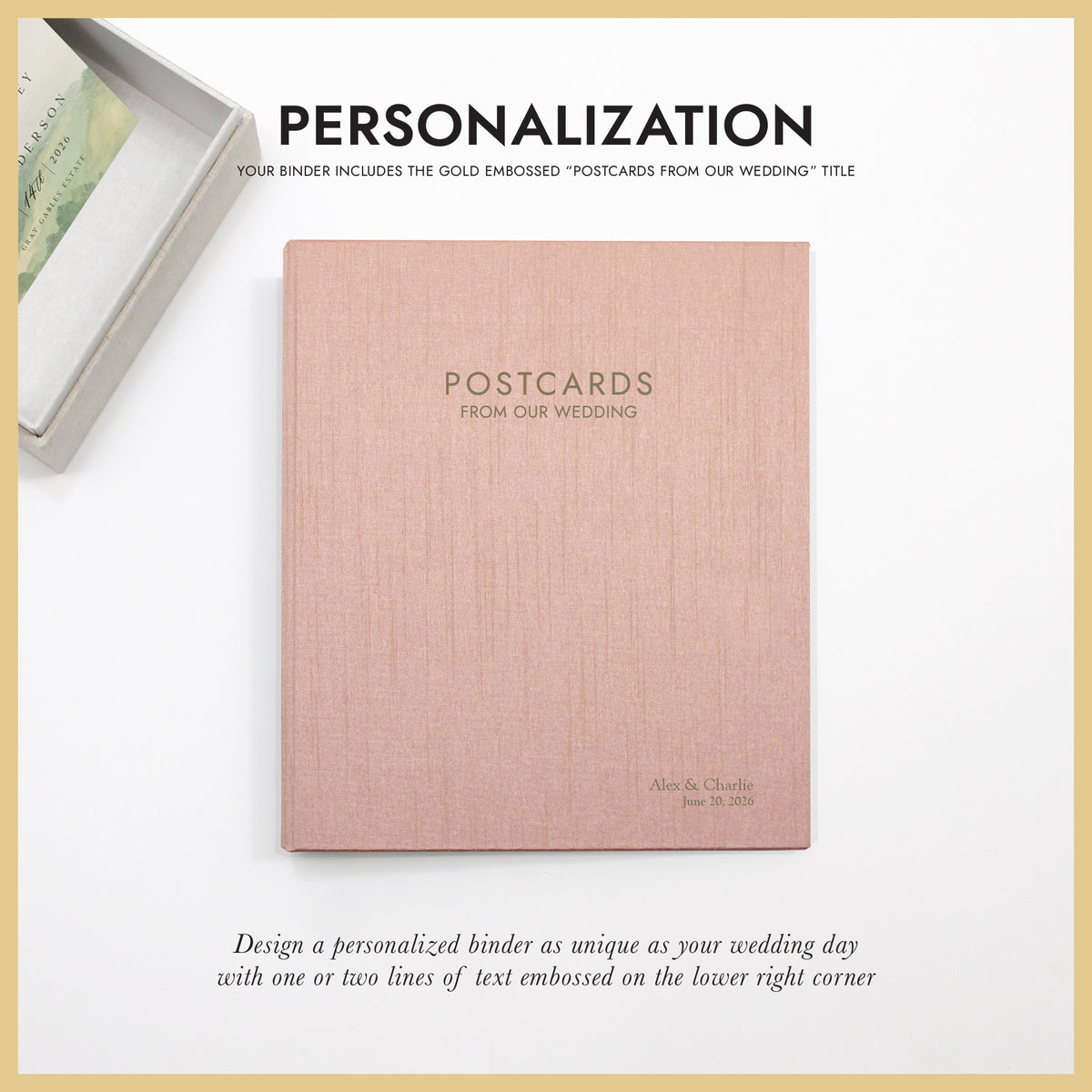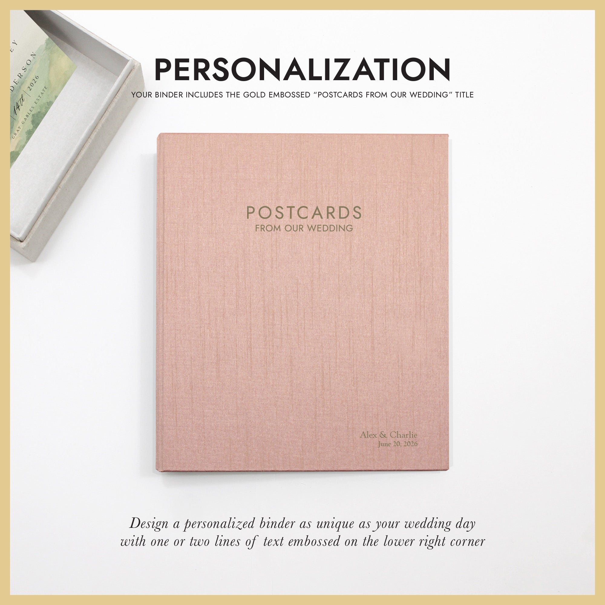 COVER: The cover is gold embossed with POSTCARDS FROM OUR WEDDING. This embossed title is included in the price. This title is not editable at this time.