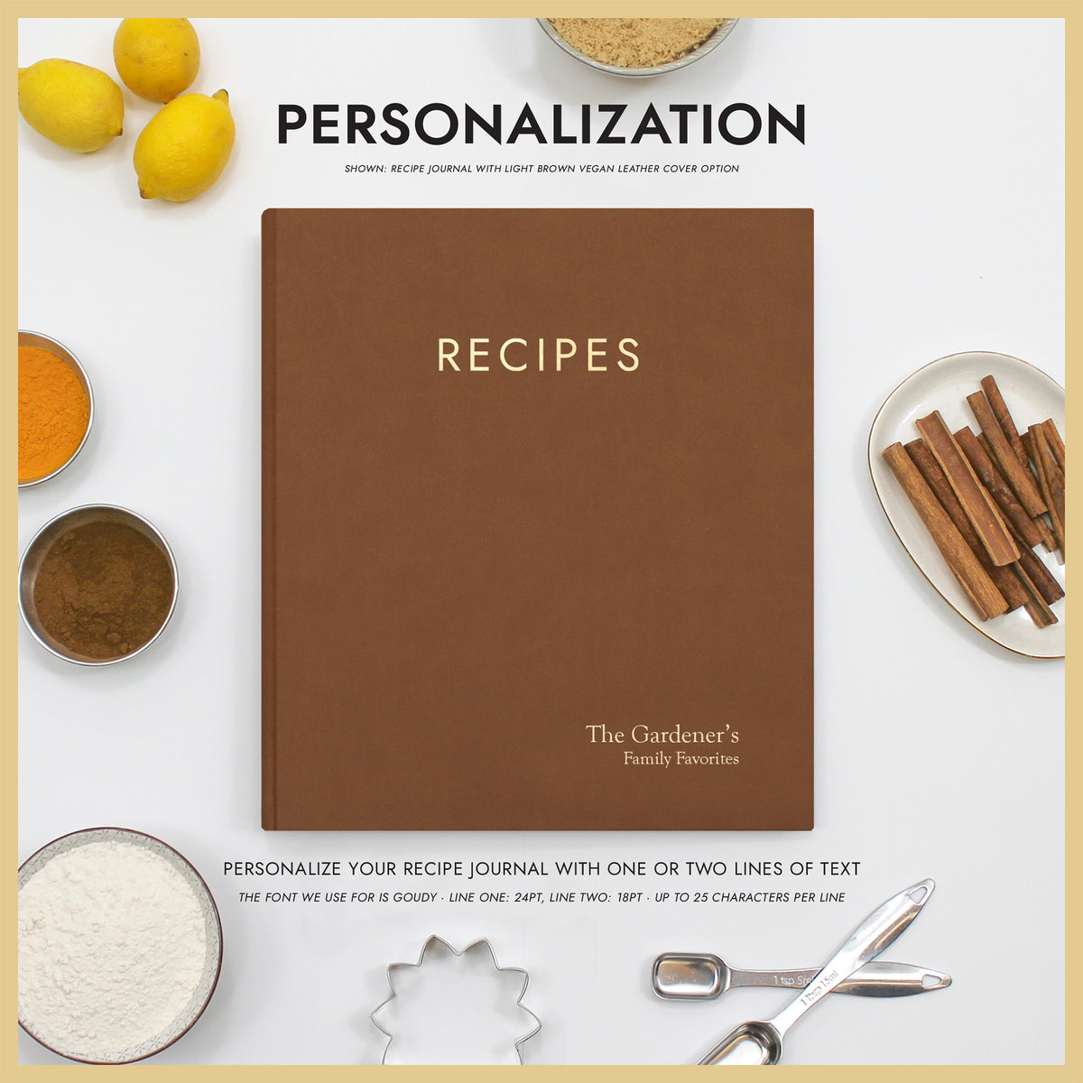 PERSONALIZATION: We can emboss a family name, or short message right on the front cover and / or the spine to add a distinctive touch to your Recipe Journal. The font we use is Goudy, and we can emboss up to 25 characters per line on the cover, and 25 characters on the spine. We recommend Title Case (not all caps) for embossing. See additional product image for embossing examples.