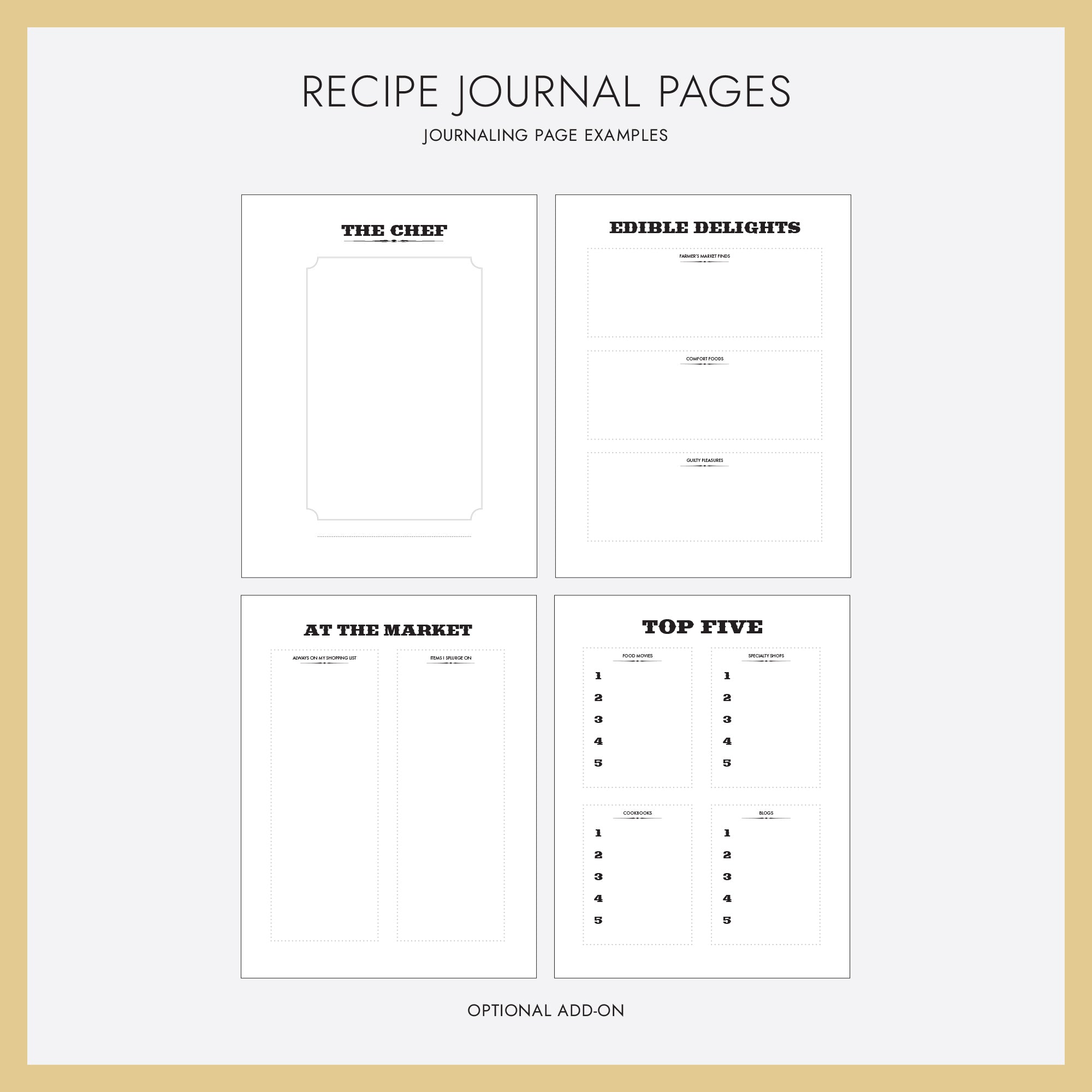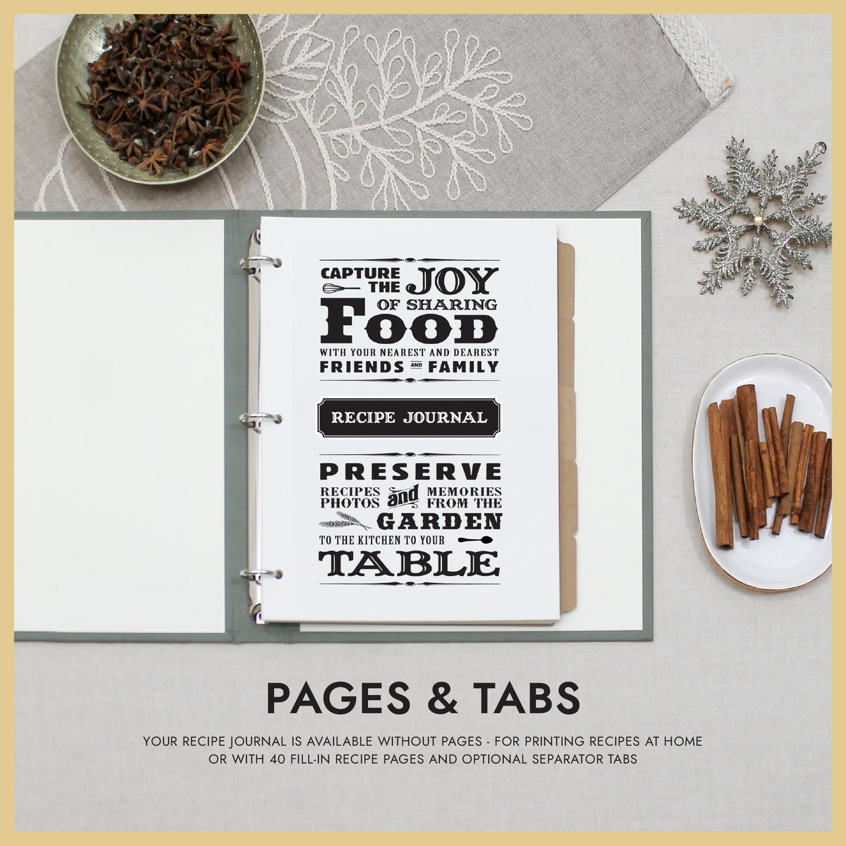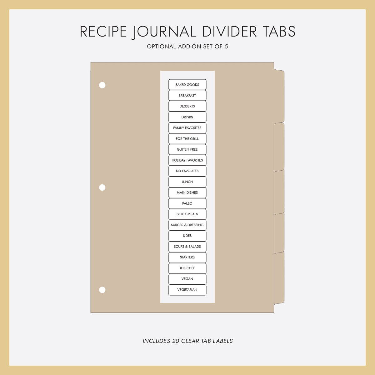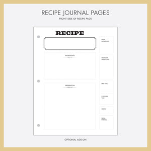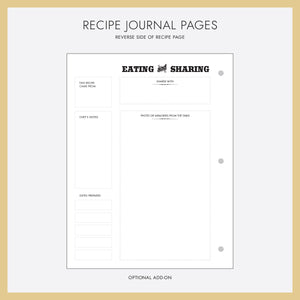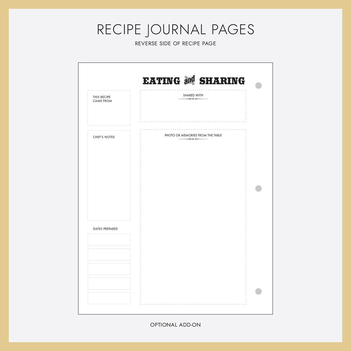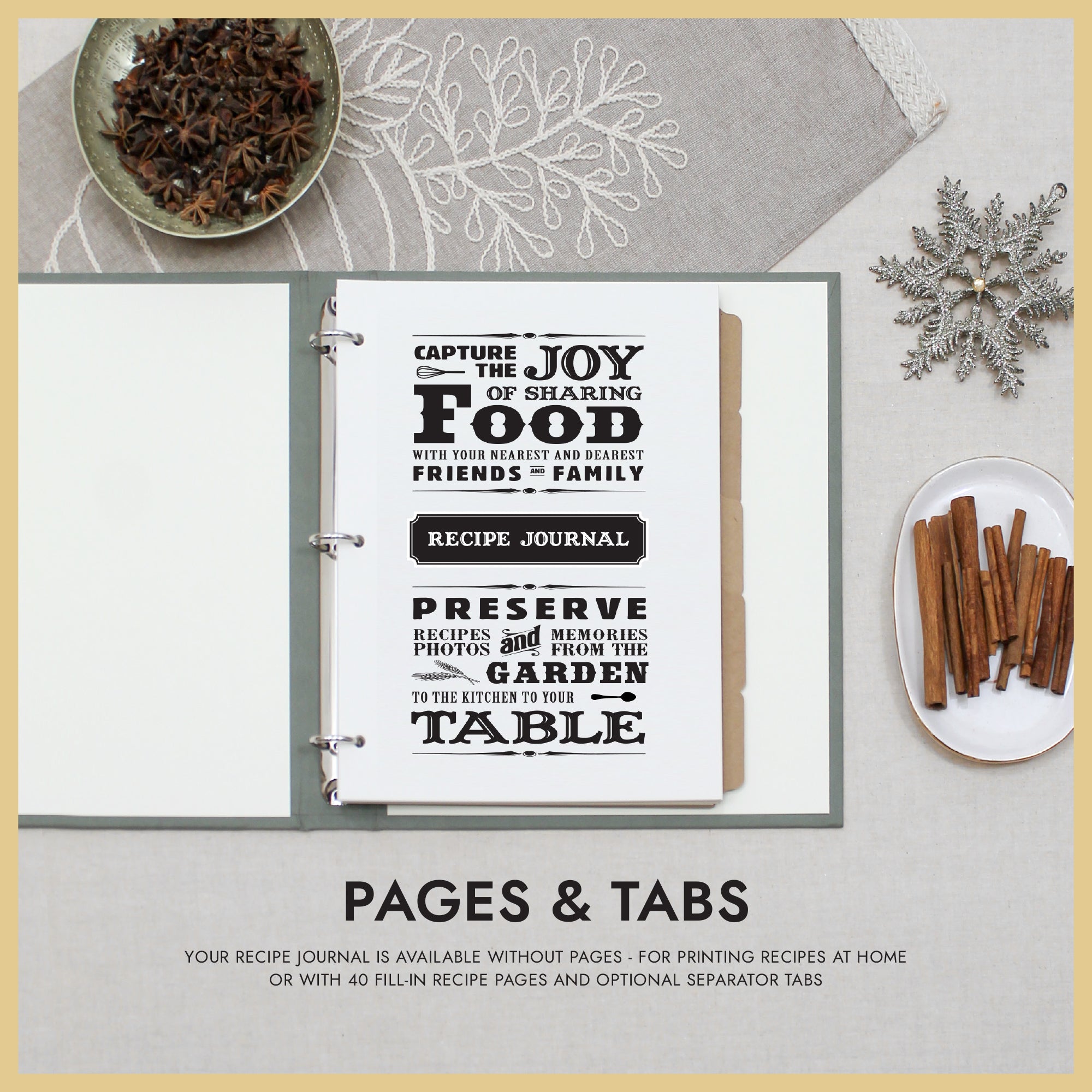 ADD-ONS: Printed 8.5 x 11 recipe pages include all the basics: ingredients, preparation, cooking instructions, variations, prep time, servings and pairings as well as dates cooked, shared with, source, chef notes and room for a photo of the finished recipe. Tabs are moveable to divide sections such as appetizers, main dishes, deserts, drinks, or write your own. Top loading 8.5 x 11 archival sleeves are perfect for printed recipes from your favorite websites. Without add-ons, the Recipe Journal binder holds standard 8.5 x 11 paper pages.