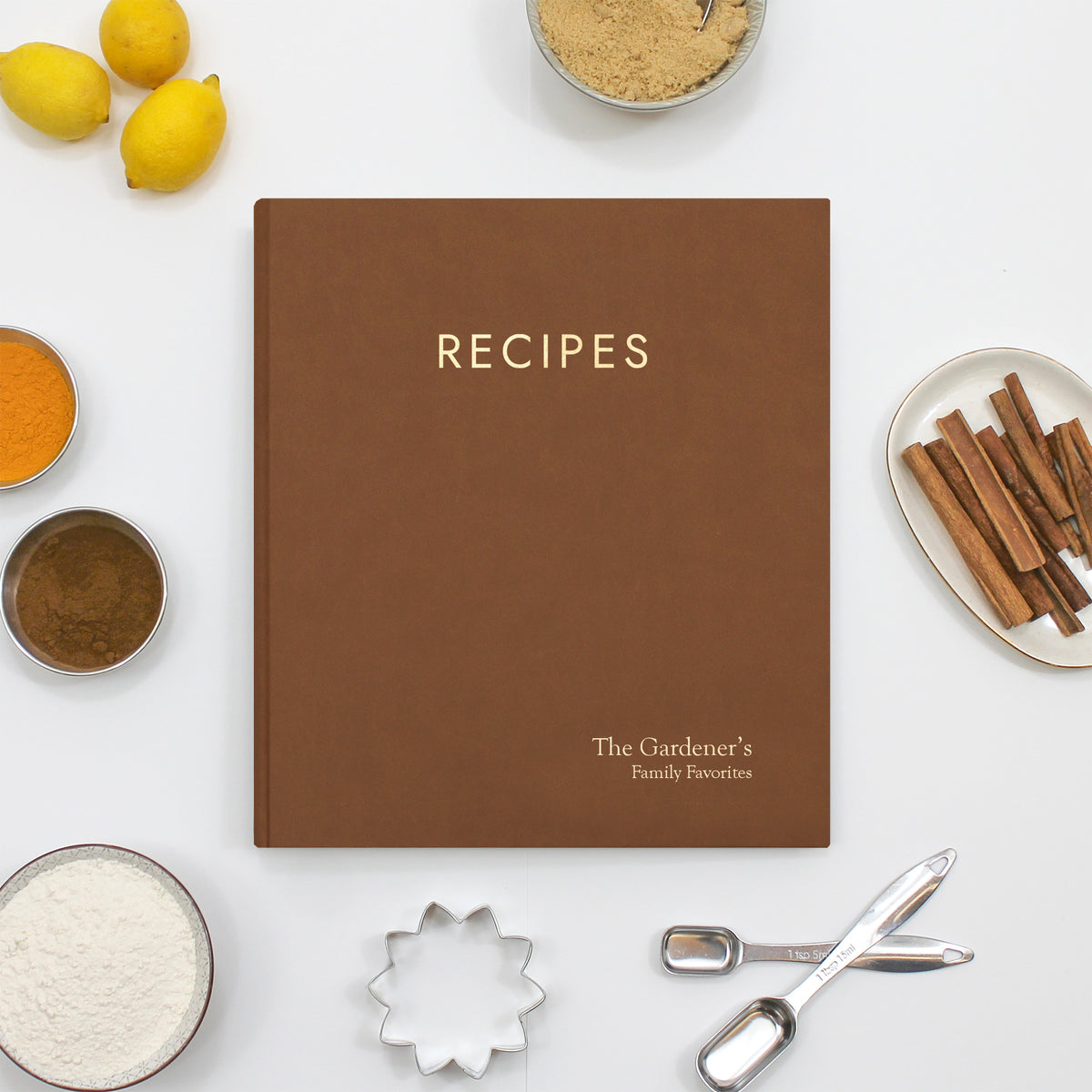 Recipe Journal Embossed with "RECIPES" covered with Brown Vegan Leather