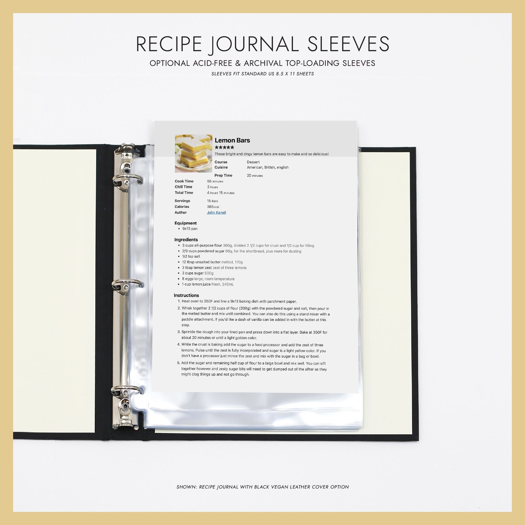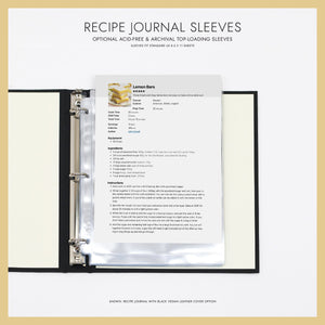 ADD-ONS: Printed 8.5 x 11 recipe pages include all the basics: ingredients, preparation, cooking instructions, variations, prep time, servings and pairings as well as dates cooked, shared with, source, chef notes and room for a photo of the finished recipe. Tabs are moveable to divide sections such as appetizers, main dishes, deserts, drinks, or write your own. Top loading 8.5 x 11 archival sleeves are perfect for printed recipes from your favorite websites. Without add-ons, the Recipe Journal binder holds standard 8.5 x 11 paper pages.