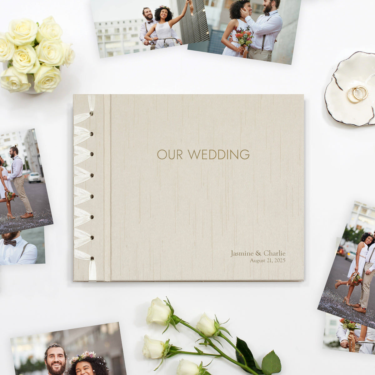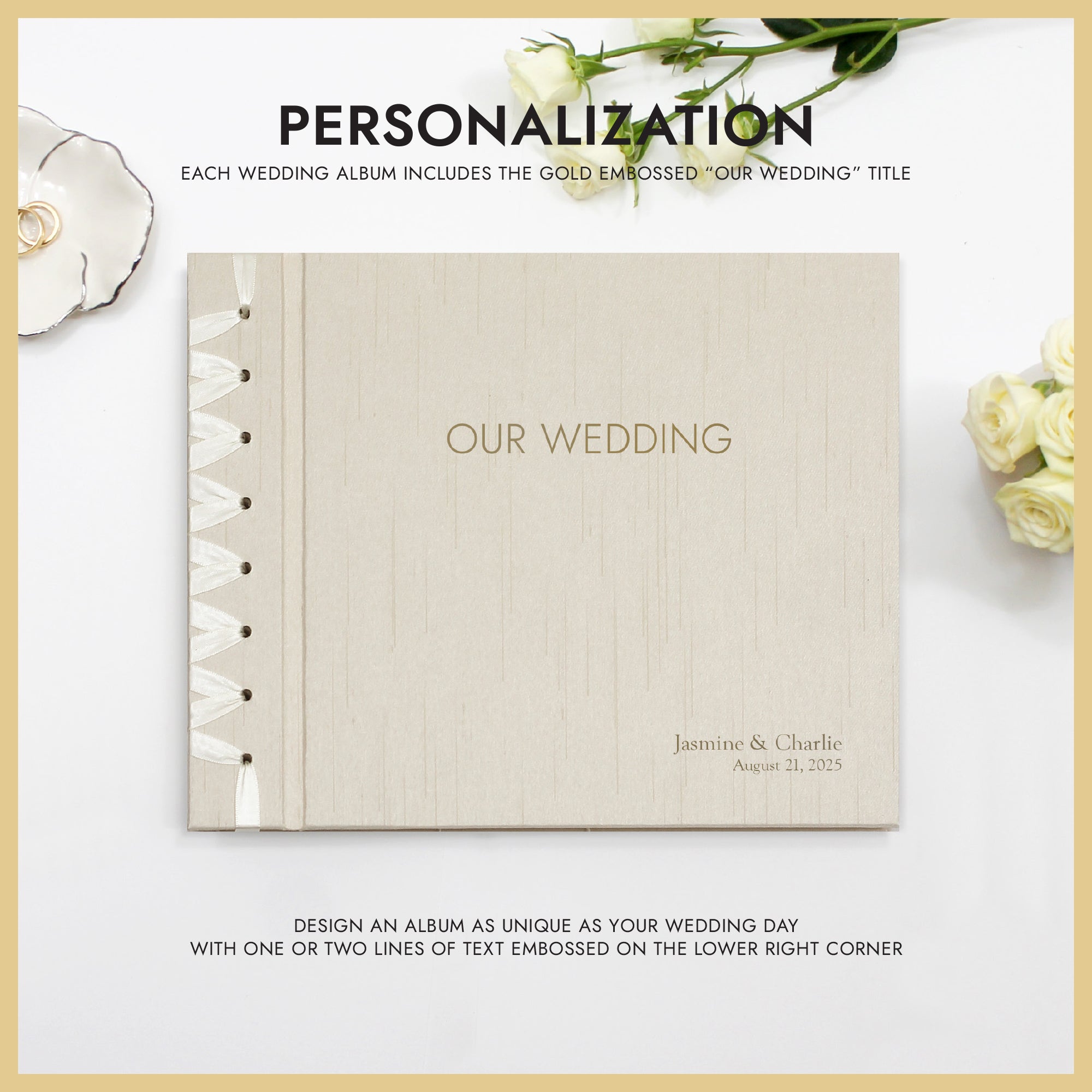 PERSONALIZATION: We can emboss a name, date, or a short message onto the front cover to add a distinctive, personal touch to your Wedding Album. The font we use is Goudy, and we can emboss one or two lines in the lower right corner, and up to 25 characters per line. See additional product images for personalization examples. The “OUR WEDDING” title is included in the price.