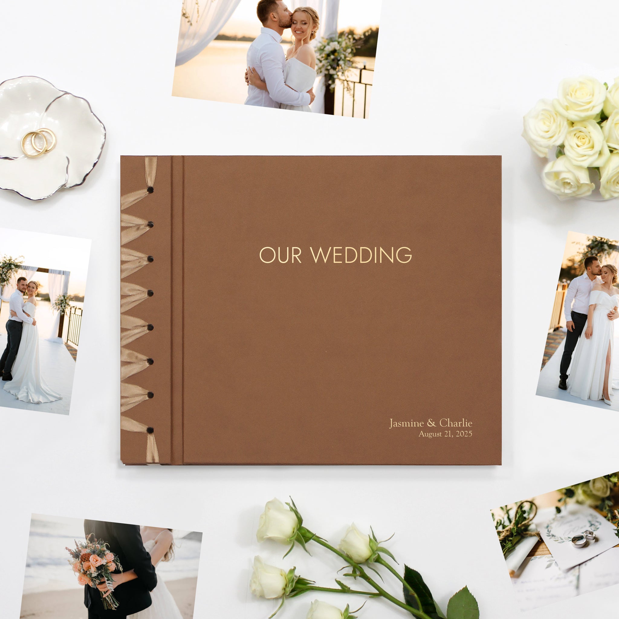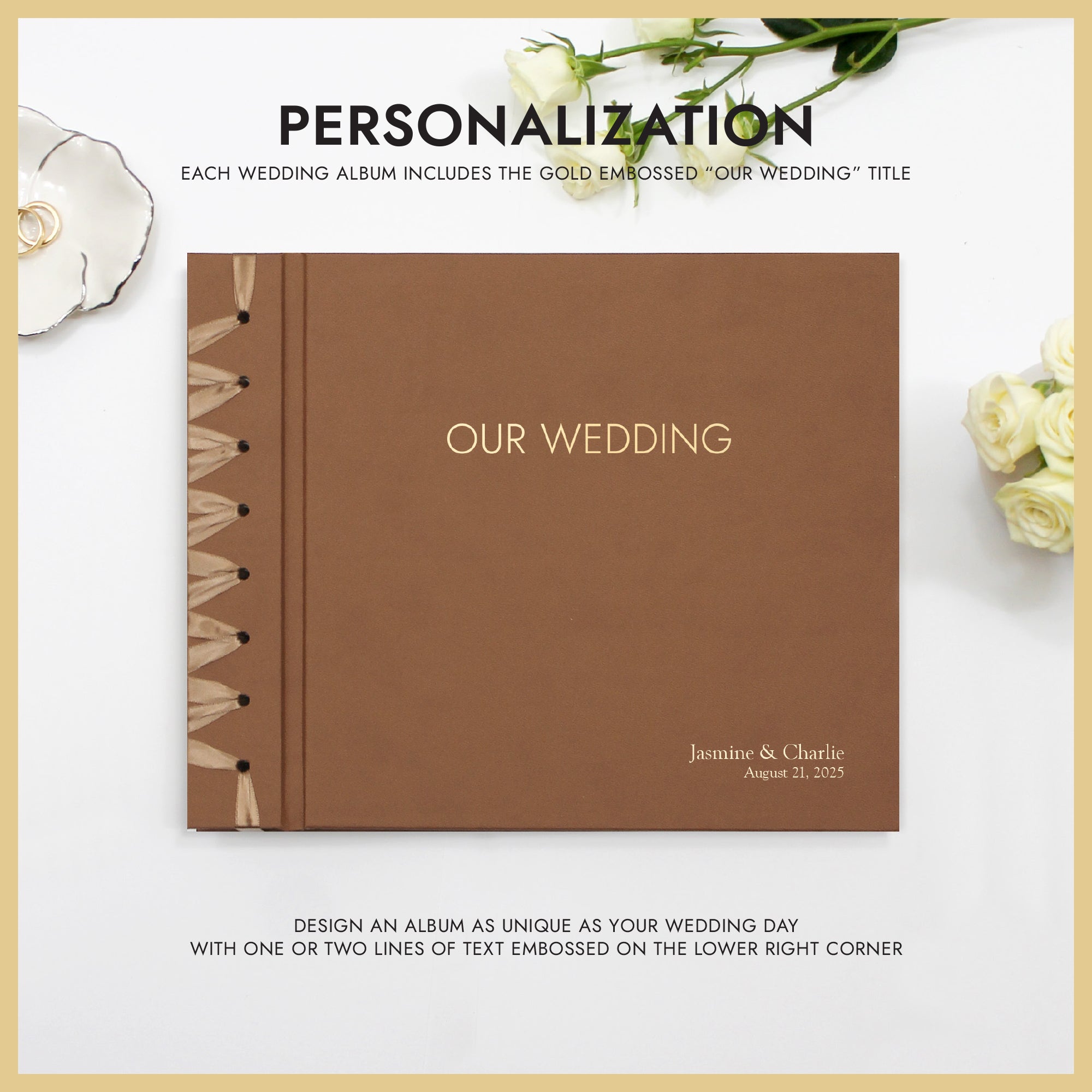 PERSONALIZATION: We can emboss a name, date, or a short message onto the front cover to add a distinctive, personal touch to your Wedding Album. The font we use is Goudy, and we can emboss one or two lines in the lower right corner, and up to 25 characters per line. See additional product images for personalization examples. The “OUR WEDDING” title is included in the price.