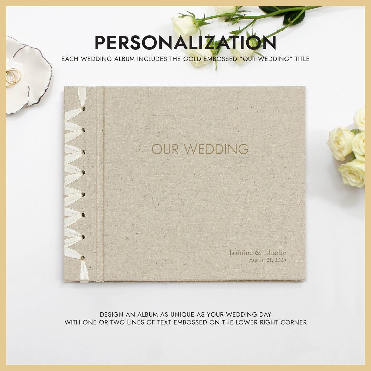 PERSONALIZATION: We can emboss a name, date, or a short message onto the front cover to add a distinctive, personal touch to your Wedding Album. The font we use is Goudy, and we can emboss one or two lines in the lower right corner, and up to 25 characters per line. See additional product images for personalization examples. The “OUR WEDDING” title is included in the price.