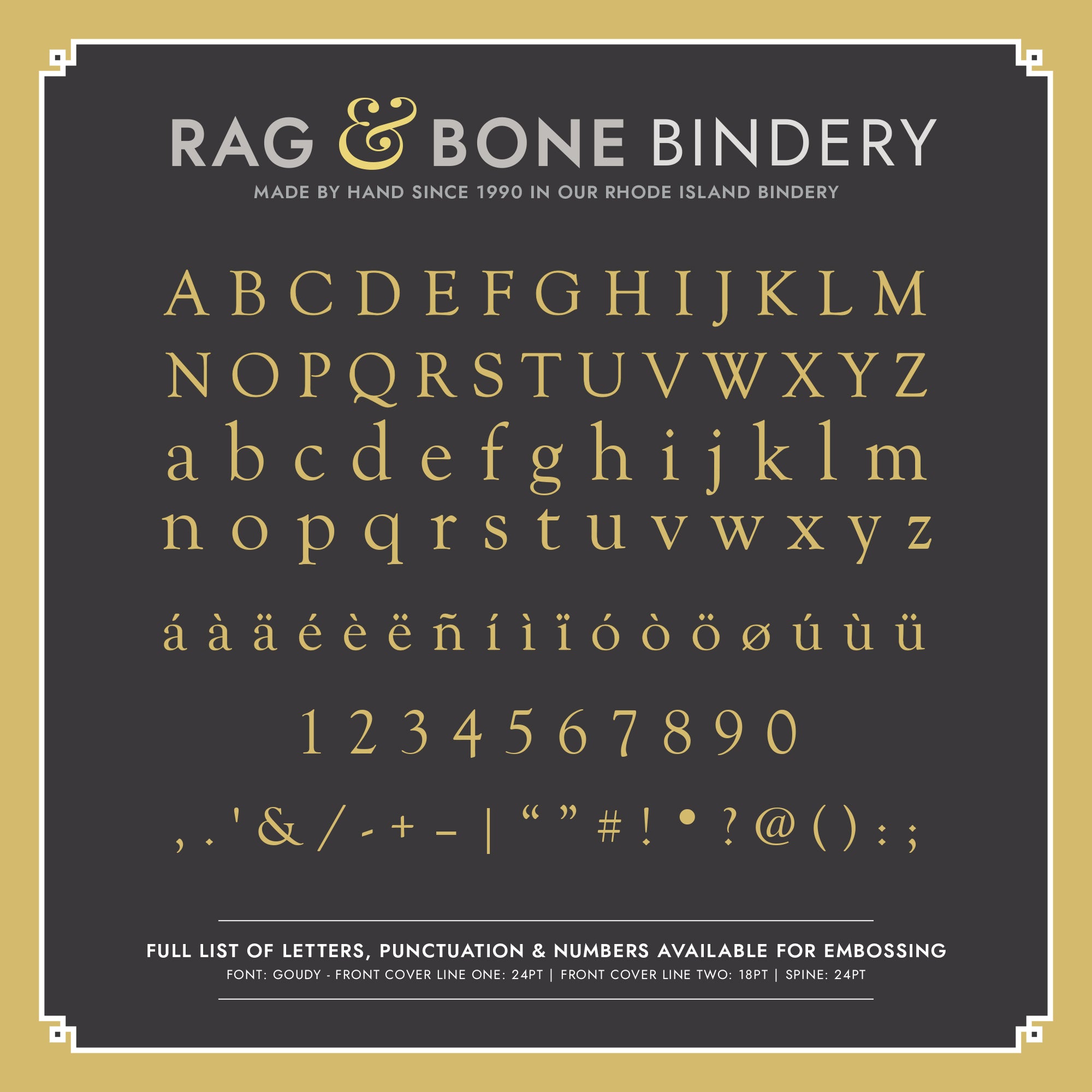 EMBOSSING: Emboss a name, date, project title, company, or other short message on the lower right corner of the front cover, or onto the spine, for a unique and personalized Storage Binder. The font we use is Goudy, and we can emboss up to 25 characters per line. See additional product images for embossing details.