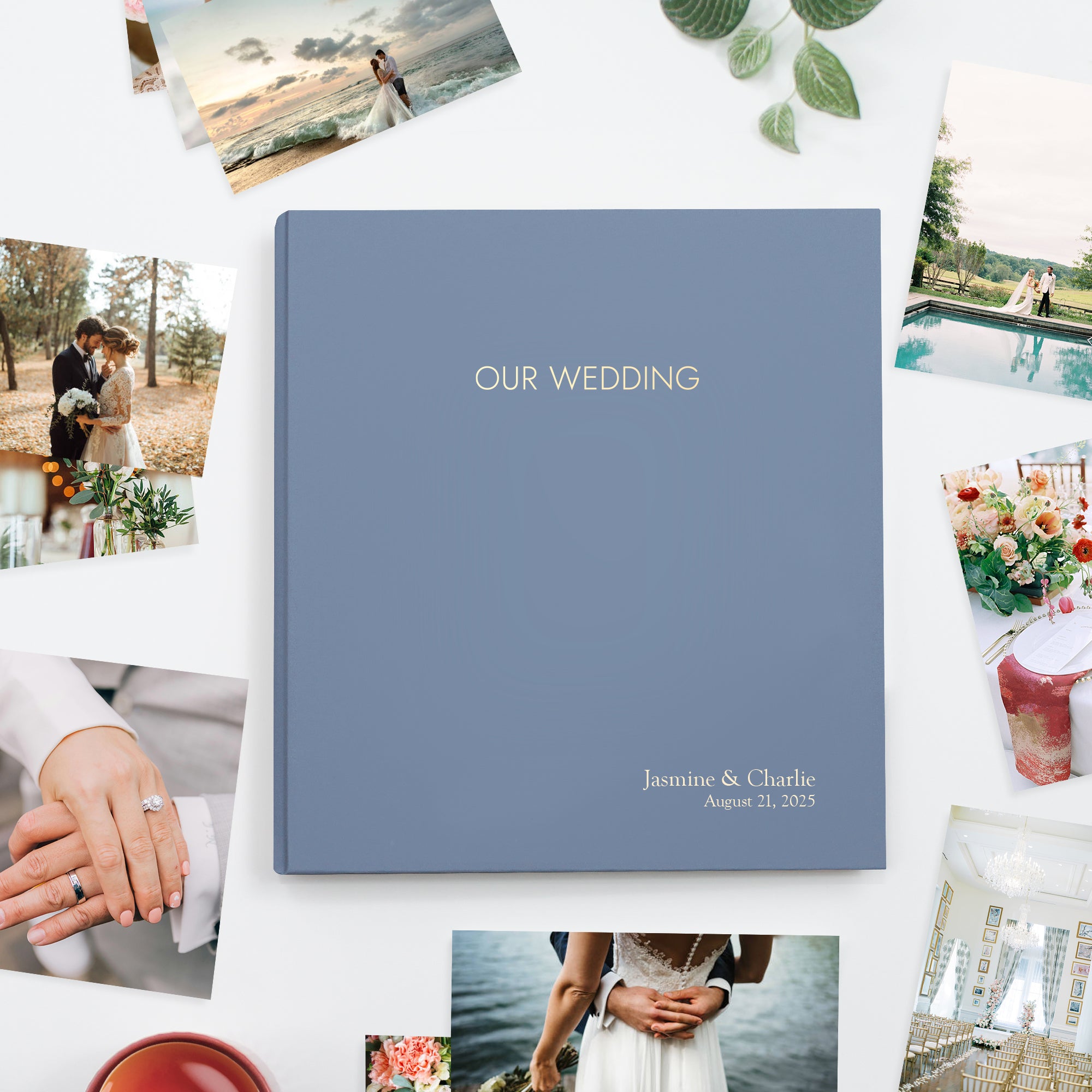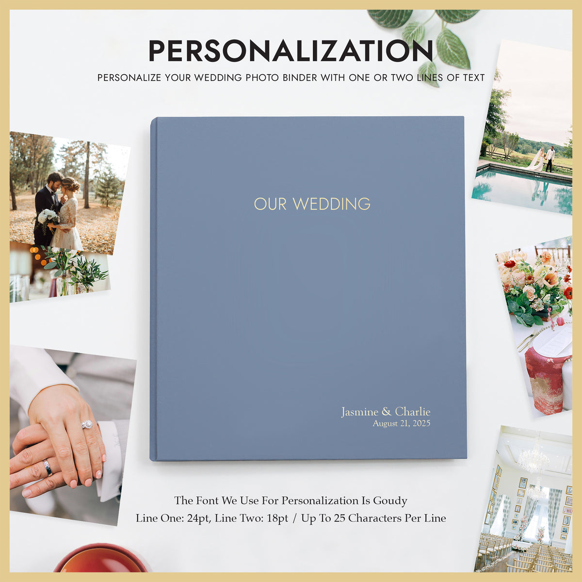 PERSONALIZATION: Make your Wedding Photo Binder truly unique with custom embossing. Personalize the cover with the couple's names, wedding date, a special message, or event name, up to 25 characters per line, in our classic Goudy font. The embossed title "OUR WEDDING" is included on the cover (this title is not editable). See product images for embossing examples.
